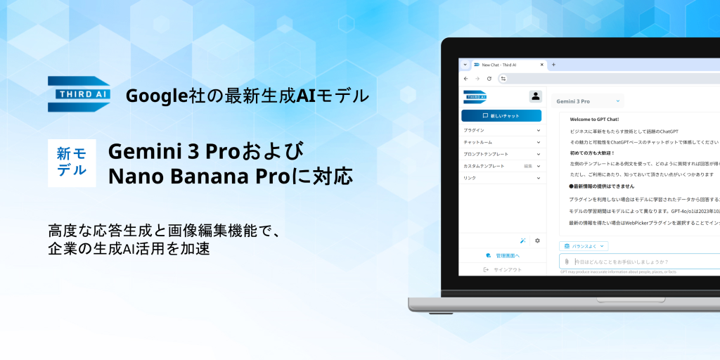 AIインテグレーションサービス「Third AI」を提供するJTP株式会社(本社:東京都品川区、代表取締役社長:森 豊、以下:JTP)は、2025年11月21日、生成AIのビジネス活用を支援する「Third AI 生成AIソリューション」において、Google社の最新生成AIモデル「Gemini 3 Pro」および「Nano Banana Pro(Gemini 3 Pro Image)」への対応が完了したことをお知らせします。