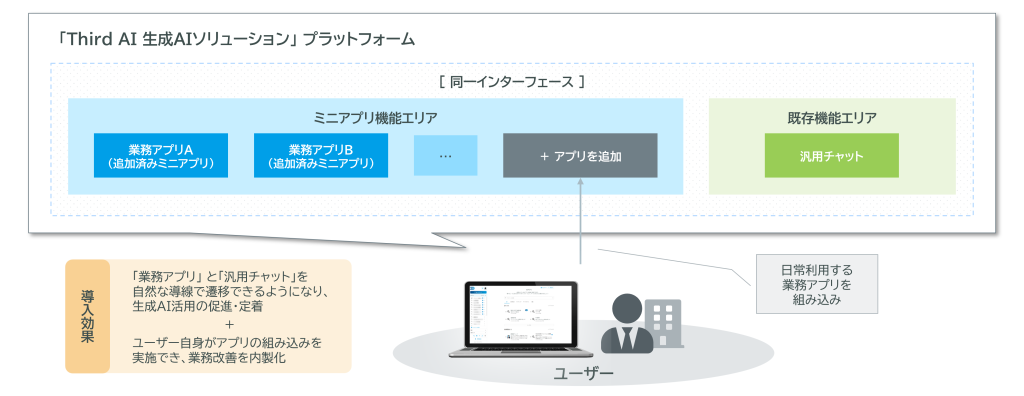 このような課題に対し、この度追加したミニアプリ機能では、「Third AI 生成AIソリューション」のプラットフォーム上に業務アプリケーションを表示することで、汎用チャット機能と業務アプリケーションを1つの画面上で並行して操作できるようになります。ツール間の行き来や画面切り替えによる中断が減ることで、生成AIを「使いたい時にすぐ使える」状態に近づけ、現場での活用促進・定着が期待できます。
