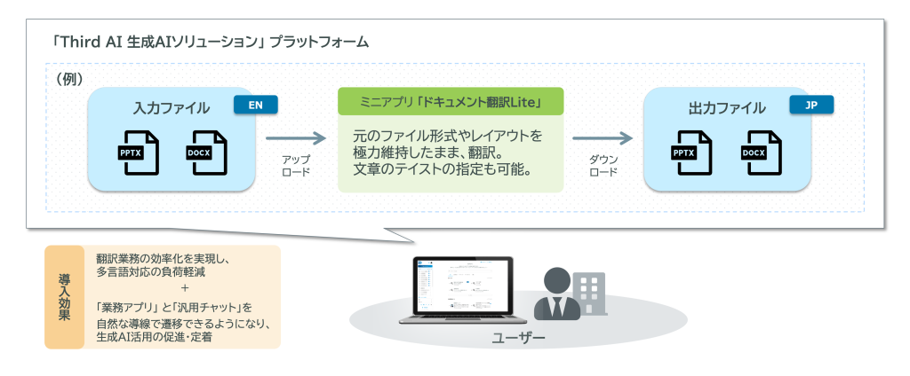 AIインテグレーションサービス「Third AI」を提供するJTP株式会社(本社:東京都品川区、代表取締役社長:森 豊、以下「JTP」)は、2026年3月24日、生成AIのビジネス活用を支援する「Third AI 生成AIソリューション」のAIプラットフォーム上で利用できるミニアプリとして 、「ドキュメント翻訳Lite」を新たに追加しました。これにより、ユーザーはプラットフォーム上でドキュメントをアップロードするだけで 、翻訳済みファイルを生成 できるようになります。