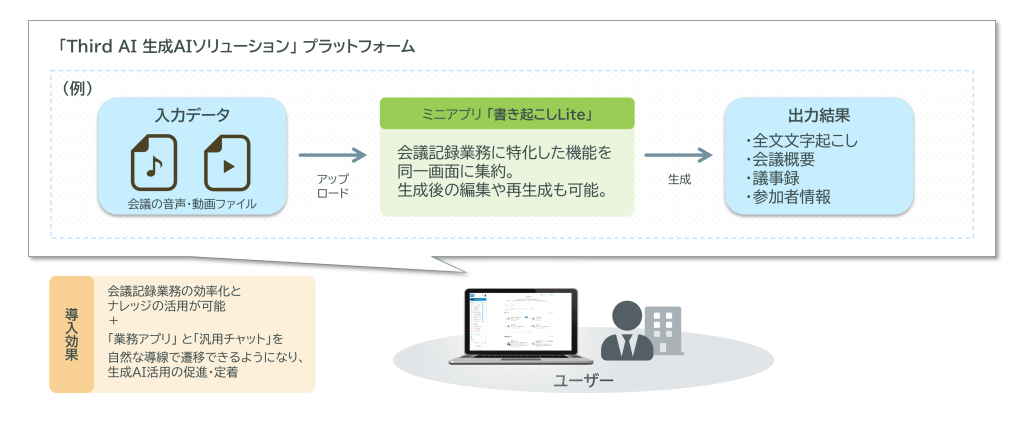 このたび追加した「書き起こしLite」は、これらの課題に対応するために開発されたミニアプリです。会議の録音・録画データをアップロードするだけで、AIが全文を文字起こしし、概要や構造化された議事録の自動生成、参加者情報の整理を支援します。さらに、「Third AI 生成AIソリューション」上で利用できるため、生成AIの活用を日常業務に無理なく取り入れながら、会議運営・情報共有の効率化を実現します。
